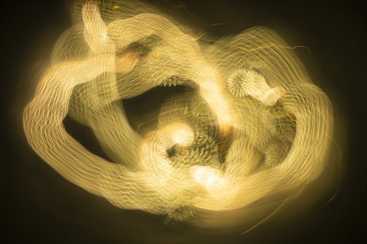 夏の夜に打ち上げられる花火は日本の夏の風物詩です。大きな花火は小さな花火が集まって出来ていて、空に打ち上るとそれらは一瞬で同心円状に広がりやがて消えていきます。通常の写真ではそれらは円状に一体となって写り、細やかな火花や弾ける様子と消えゆく様子は表現できませんが、ICMで撮影すると、火花の明滅が時間軸上に引き伸ばされ、弾ける瞬間から消えゆくまでの過程が詳細に写し出されます。カメラの自由な動かし方と花火の爆発エネルギーは複雑な偶然性を生み、宇宙や架空の生き物をも想起させる、抽象的かつ有機的な像を生み出します。それは、身体運動に絵具の粘性や重力などの物理特性による偶然性を組み合わせたアクションペインティングに近いものです。