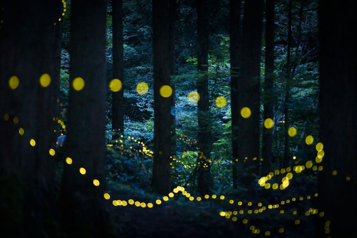ヒメボタルは撮影者の思い通りには飛んでくれず、その光跡はすべて偶然に委ねられています。そのため彼は、タイマー・レリーズを装着した複数台のカメラで一晩に約1000枚を撮影し、6月初旬から7月末までほぼ毎日撮影を続けます。シーズン中の総枚数は4万枚を超えますが、作品として選ぶのはわずか20〜30枚です。