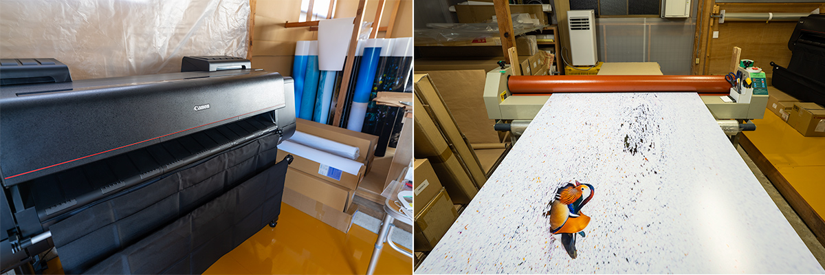 彼は趣味の木工とロボット開発の経験を活かし、自宅の車庫をプリント工房にリフォーム。そこに44インチ対応の大型プリンターと1600mm幅のコールドラミネーターを導入して、B0サイズのプリント制作やアルポリック加工(アルミ複合版によるパネル化)を行っています。また、既成の木製額に加え、独自設計のB0サイズ用のアルミ額も開発しています。